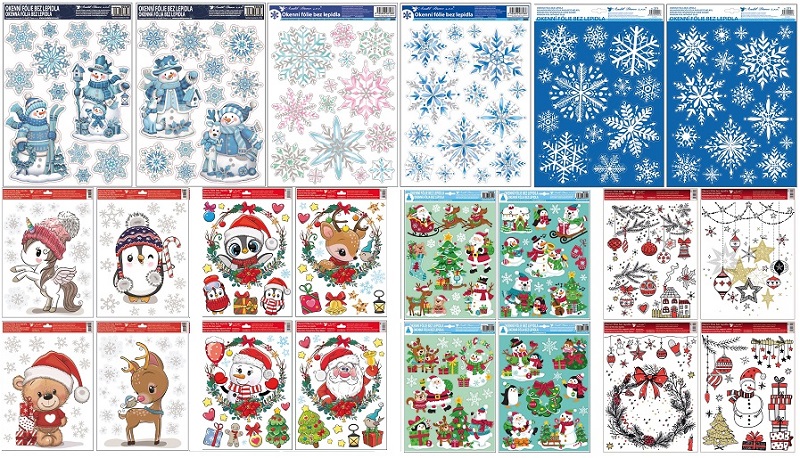 folie vánoční adhézní 42x30 cm mix motivů (vločky,shněhuláci...)