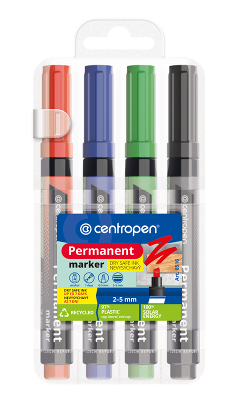 Permanentní značkovač na většinu povrchů Nevysychavý (vydrží i 14 dní bez chránítka) Odolá vodě, otěru, povětrnostním vlivům Alkoholová báze Klínový hrot Šířka stopy 2-5 mm