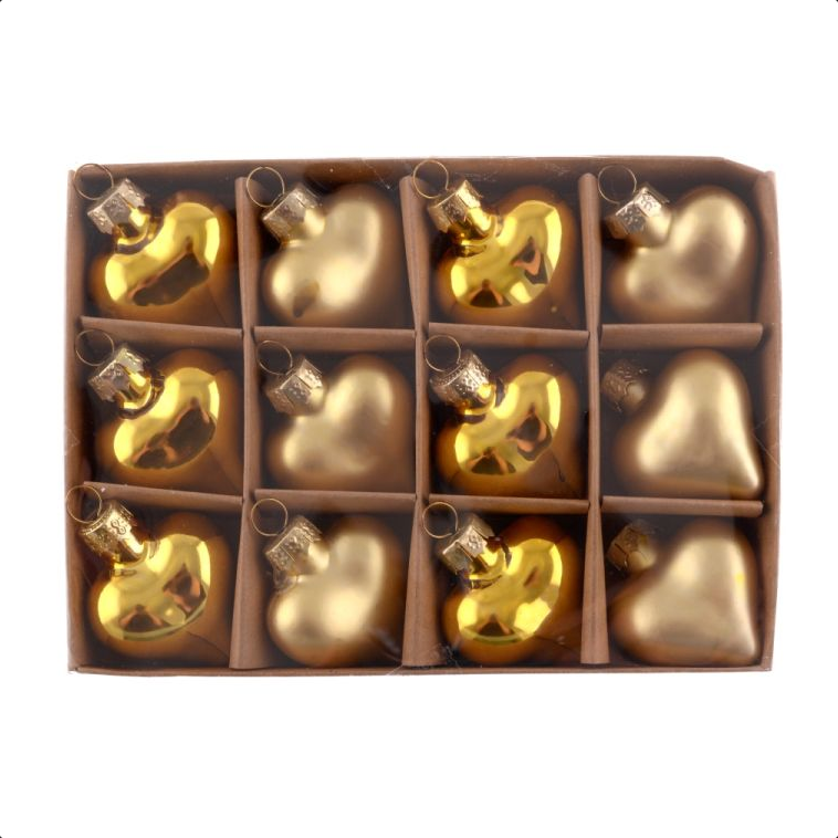 Skleněné vánoční ozdoby. Ideální k ozdobení malého stromečku či věnce. Materiál: sklo Velikost: 3,5 x 4,5 cm Barva: zlatá, mix lesk/mat Cena je uvedena za 1 balení.