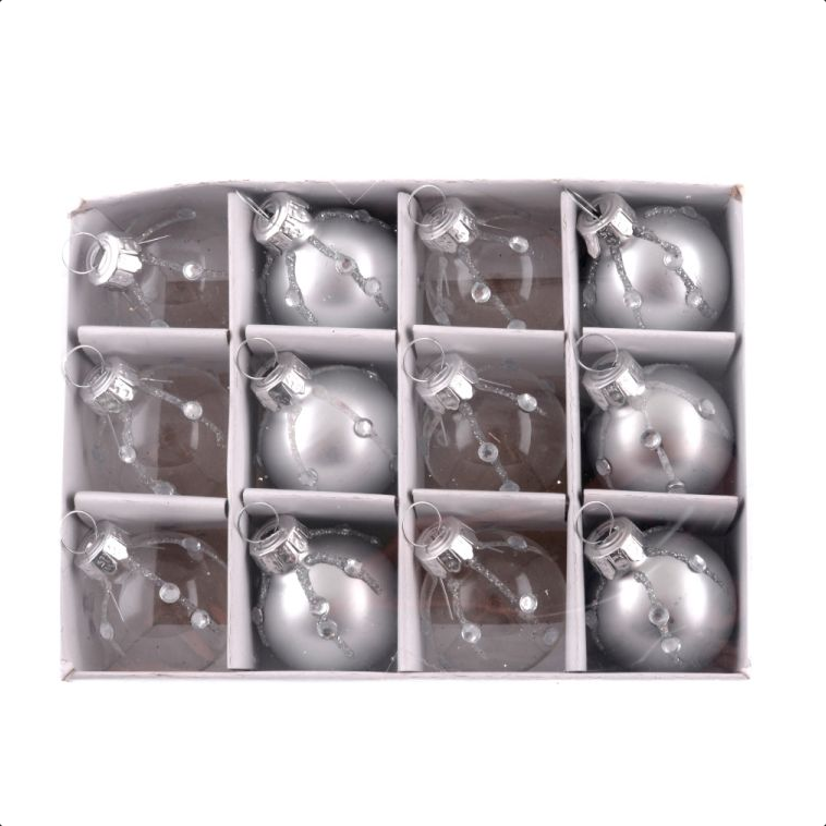 Skleněné vánoční ozdoby. Ideální k ozdobení malého stromečku či věnce. Materiál: sklo Velikost: pr.3 cm Barva: čirá/stříbrná Cena je uvedena za 1 balení.