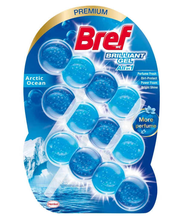 Bref Brilliant Gel se svým All in 1 složením se 4 funkcemi nejenže čistí toaletu při každém spláchnutí, ale také poskytuje svěžest a brilantní lesk.